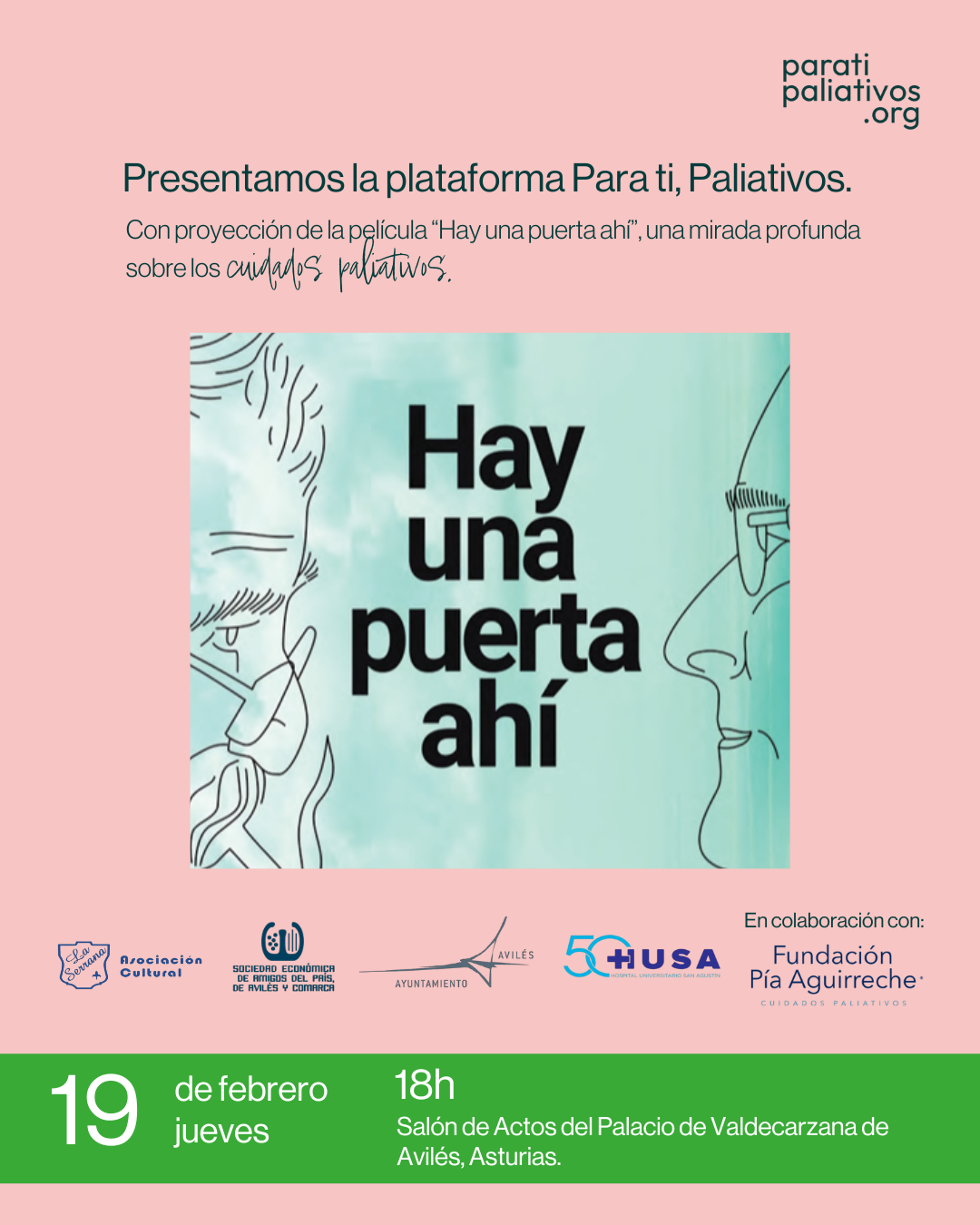 | Hospital Universitario San Agustin de y el Ayuntamiento de Áviles en colaboración con la fundación Pia Aguirreche presentará la plataforma para ti Paliativos y proyectará la película "Hay una Puerta ahí" en Áviles (Asturias) | Jueves 19 de Febrero de 2026, a las 18h | Sala de Conferencias de la Salón de Actos del Palacio de Valdecarzana de Áviles (Astrurias). | Más información |